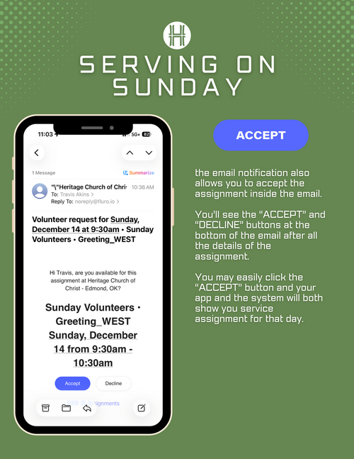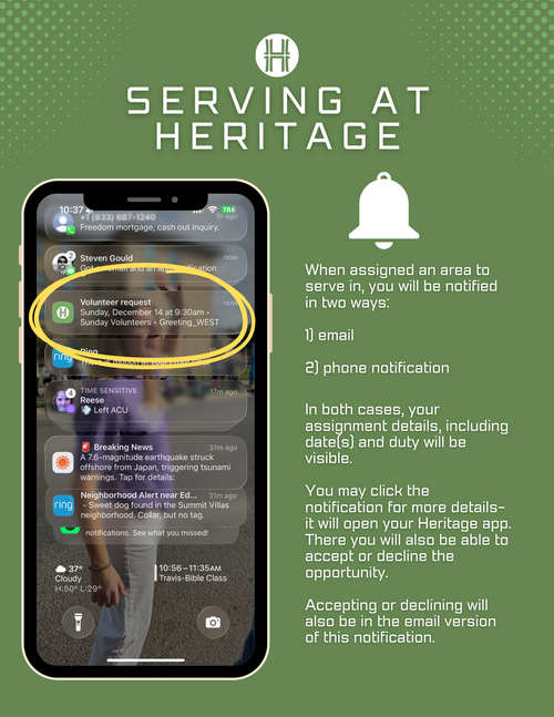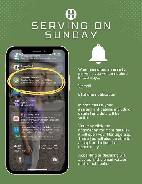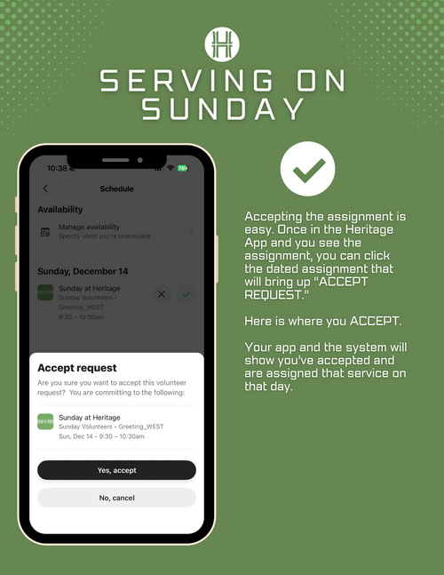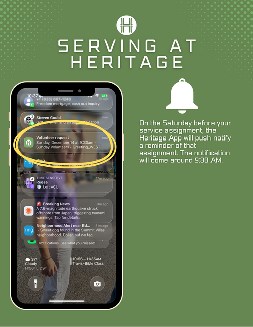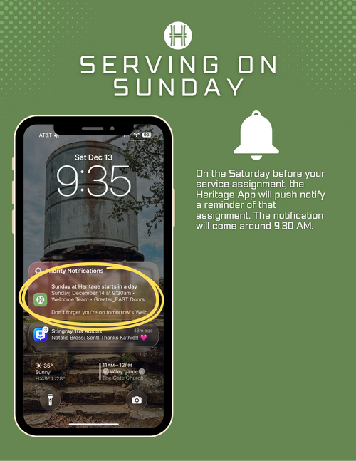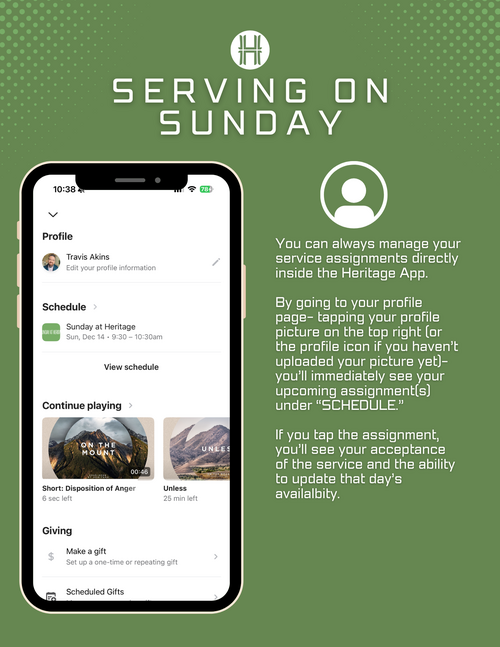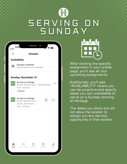 To support this shared commitment, Sunday mornings at Heritage now operate on an “opt-out” system. Everyone 16 and older will be scheduled periodically to serve in different areas throughout the year. You’ll receive your assignments through email and the Heritage app, where you can easily see when and where you’re scheduled. If a date doesn’t work, you can simply opt out or request a swap. This system helps us plan well, distribute responsibilities fairly, and ensure that no one carries the load alone.